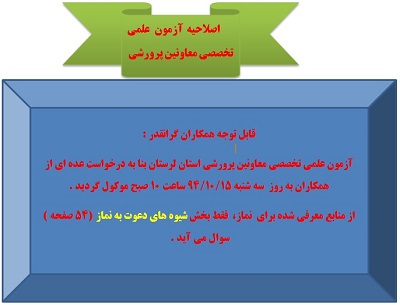بنا به درخواست بعضی از همکاران گرامی و طی تماسی که با سرگروه محترم استان استاد مرادی داشتم و پیگیری های ایشان با آقای برخورداری و سایر دوستان در اداره کل آزمون تخصصی به شرح بخشنامه شماره 36142 مورخه 8/9/94 اداره کل به مورخه سه شنبه 94/10/15 موکول گردید